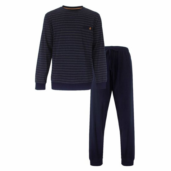 Deze Paul Hopkins herenpyjama biedt een perfecte mix van draagcomfort en een verzorgde uitstraling. De donkerblauwe top is uitgevoerd met een modern geprint dessin en voorzien van een paspel borstzakje met een subtiel geborduurd logo. De ronde hals met ribboord sluit comfortabel aan. De lange broek beschikt over praktische zijzakken en boorden met elasthan, die zorgen voor een uitstekende pasvorm en bewegingsvrijheid.