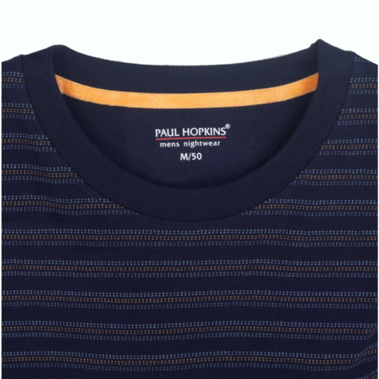 Deze Paul Hopkins herenpyjama biedt een perfecte mix van draagcomfort en een verzorgde uitstraling. De donkerblauwe top is uitgevoerd met een modern geprint dessin