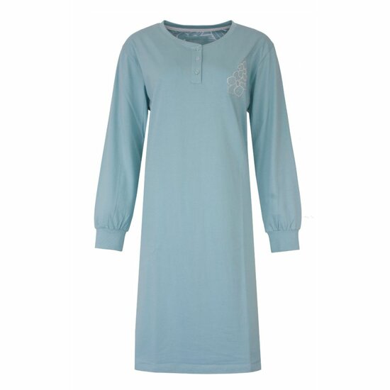 Dit damesnachthemd van Tenderness is uitgevoerd in een frisse aqua-blauwe kleur en vervaardigd van 100% gekamd katoen. De ademende en soepele stof draagt prettig en is vriendelijk voor de huid. De borst is voorzien van een subtiel geborduurd bloemendessin, wat het nachthemd een elegante en vrouwelijke uitstraling geeft. Het model beschikt over een ronde hals met knoopsluiting (drie knoopjes) en een rekbaar boordje. De lange mouwen met manchetten bieden extra comfort en warmte. Dankzij de lengte van circa 100 cm biedt het nachthemd voldoende bedekking en bewegingsvrijheid.